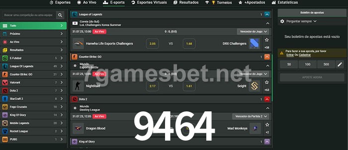 O 9464 oferece uma grande seleção de opções de apostas em e-sports com probabilidades competitivas